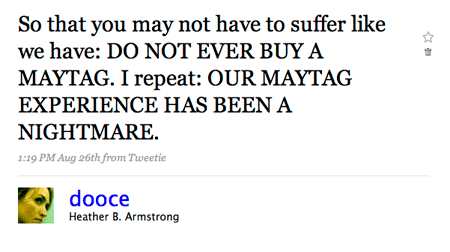 In the past, Armstrong has strongly denied accusations that she uses her popularity to influence her readers or “bully” companies – see her very detailed, explanatory post following a Twitter firestorm that erupted when she tweeted, to over a million followers, that consumers should boycott Maytag appliances. She also fiercely guards her right to raise her children without depending on the approval of her readers. FAQ number one on her website reads: